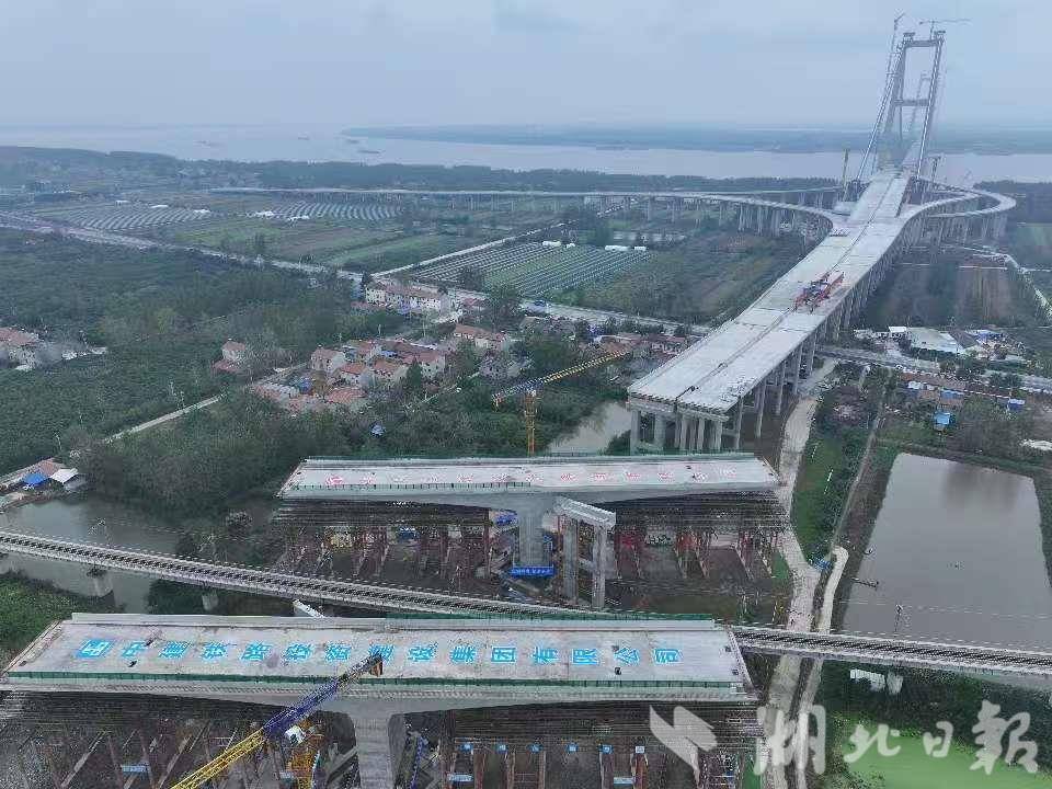 湖北日报讯(记者戴文辉通讯员王波实习生韩艳泽)10月21日,连接工程关键要素新港高速双流长江大桥与万家嘴大桥顺利完成武黄铁路线空中旋转,进入后续施工阶段,预计今年竣工。 今年年底。万家嘴大桥掉头。 (新闻组提供)万家嘴大桥全长约407米,位于武汉市新洲区魏家湾。向南几公里处,双流长江大桥正在建设中。 “平转桥为双面坡度,南高北低,西高东低,重心不在主桥墩中心,左右两侧独立搭建,同时建造,这次必须同步旋转。”只要稍有差别,就会发生碰撞。 “转桥一侧重达1.4万吨,几乎相当于两座“埃菲尔铁塔”。”中建铁投双流1号铁路招标项目总监李明浩说,完成转体后左右间距仅0.37米,技术难度极高。转体前的万家嘴大桥。(湖北日报全媒体戴记者摄) 文慧)项目组在桥上加装了配重,保证重心稳定。研发了“桥梁旋转施工实时监测系统”,实时监测桥梁姿态和结构受力的变化,动态调整各项参数,确保施工的安全性和准确性。李明浩先生将桥梁旋转的原理描述为“推磨盘”和“拉陀螺”。支柱采用球形铰链模制而成 对应小磨石下面的磨石。两侧的钢丝同时被拉动,就像撞击顶部一样,导致球铰旋转,进而带动弹簧旋转。 “我们将整个过程分为16道工序,每一步都仔细执行,确保旋转顺利、准确。”轮班于下午 1:00 开始。 21日。大约40分钟后,两座桥在空中逆时针54度交叉,越过了下方的5条黄线。来完成转弯。在大监控屏幕上,代表光束的绿色矩形与红色设计点完美对齐。完成旋转后的万家嘴大桥。 (湖北日报记者戴文辉摄)新港高速双流长江大桥及连接工程是武汉都市圈的重要组成部分。项目建成后,新州区至鄂州市的出行时间将由目前的1.5小时左右。时间将缩短至5分钟左右es.这将极大加强阳逻国际港、鄂州花湖机场、武汉国家航天产业基地与光谷片区之间的快速互联互通。这对于推动武汉都市圈一体化进程、推动区域经济社会高质量发展具有重大战略意义。