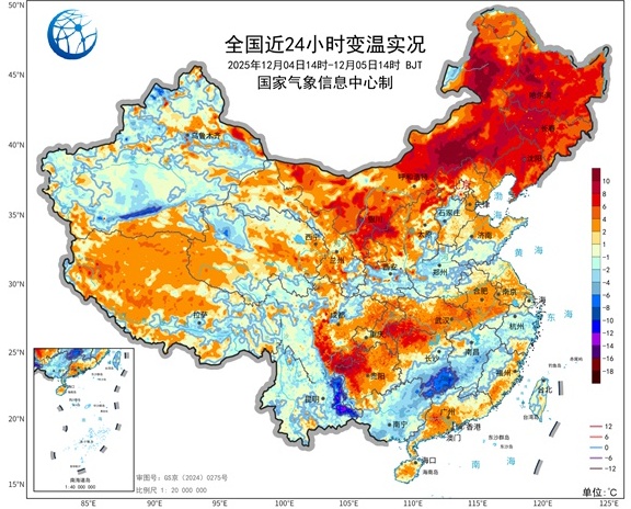 12月初寒流结束后,我国大部分地区气温持续上升。今天直播的气温变化图充满了暖色调。内蒙古和东北地区气温上升最为明显,部分地区气温超过10摄氏度。