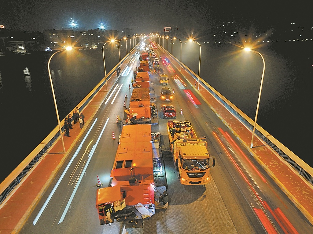 本报讯(全部记者 沈明静 通讯员于静瑶)12月18日晚10时许,长虹桥灯光明亮,机械轰鸣声不断。几个大团队齐心协力,整修了整个桥面,场面热闹非凡。