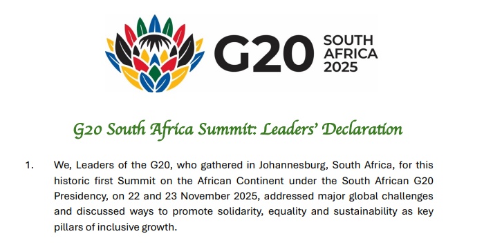 这是G20峰会开幕当天首次通过联合声明。领导人宣言共122点,强调多边合作应对全球挑战,呼吁加大支持发展中国家促进包容性增长和可持续发展。它反映了当前国际社会的共识和诉求,将重塑未来国际秩序。